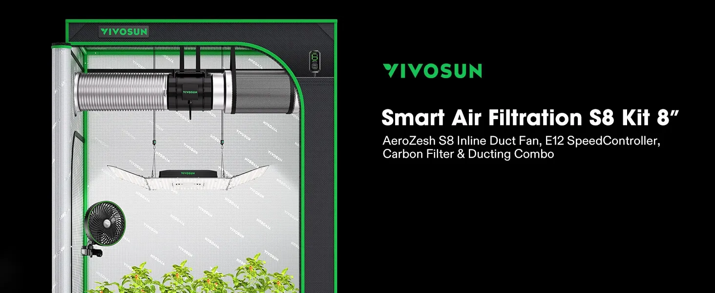 - Smart Air Filtration S8 Kit 8″, AeroZesh S8 Inline Duct Fan with E12 Speed Controller, Carbon Filter & 25′ Ducting, Cooling & Ventilation System for Grow Tents, Indoor Gardening, Hydroponics