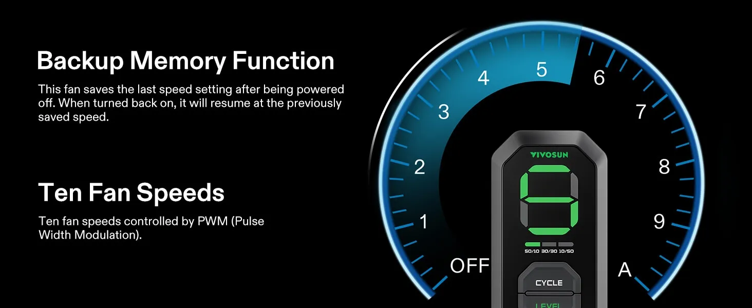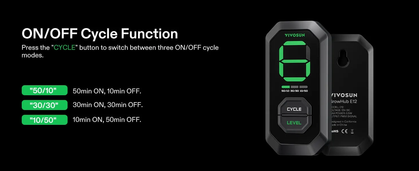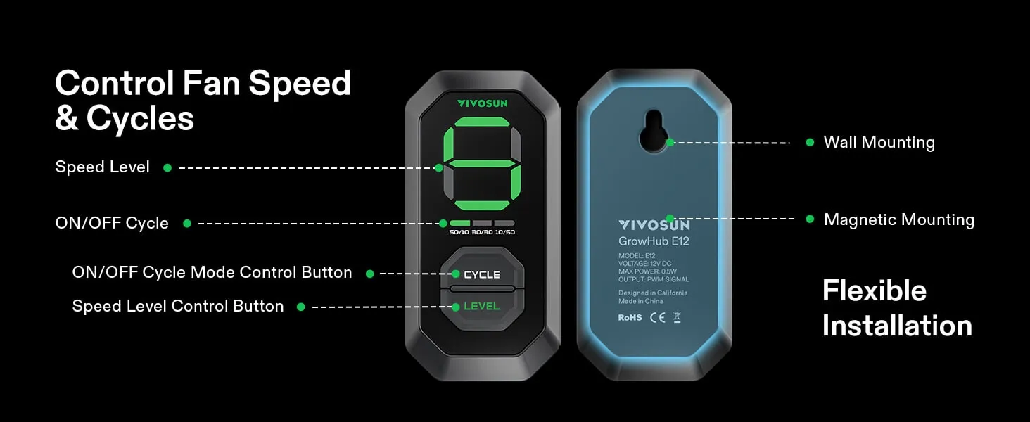 - E12 Speed Controller: Select from 10 fan speeds; easily adjustable via PWM technology; The controller features backup memory to retain the same setting after powering off/on; It enables creating automated wind speed cycles through 3 on/off timing modes to help conserve energy; The controller can be integrated with the App for intelligent remote control