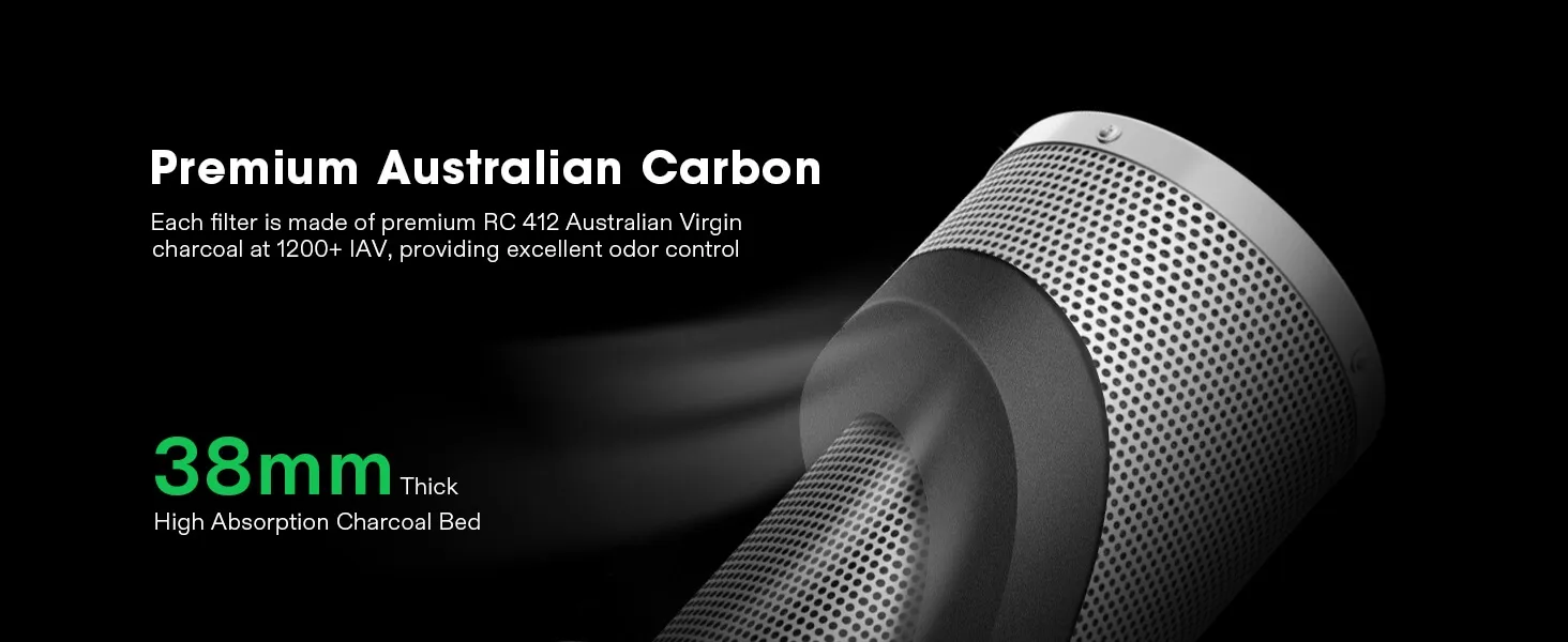 - Excellent Odor Control: Made with premium RC 412 Australian Virgin charcoal at 1200+ IAV rating, this carbon filter ensures exceptional odor elimination capabilities; The 38mm thick charcoal bed with high microporosity ensures its high absorption rate; Comes with a pair of rope hangers for easy mounting inside grow tents